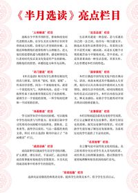 “一刊在手全家收益”。“一阴一阳之谓道”,《半月选读》将人类最自然的元素男人和女人用传统文化组合成每一期主题,从史事、人物、生活、职场等内容解读男人和女人。